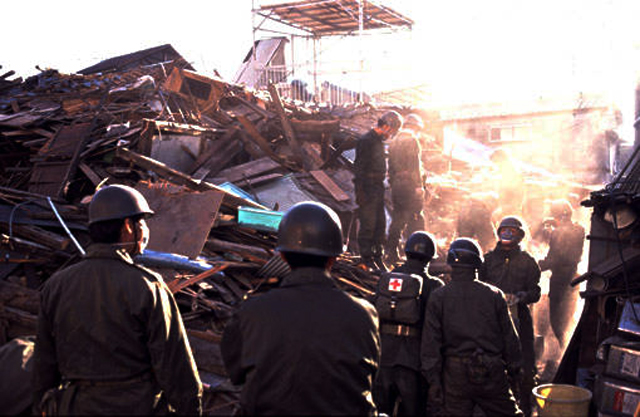 被災者救出ため行動する自衛隊。 神戸市